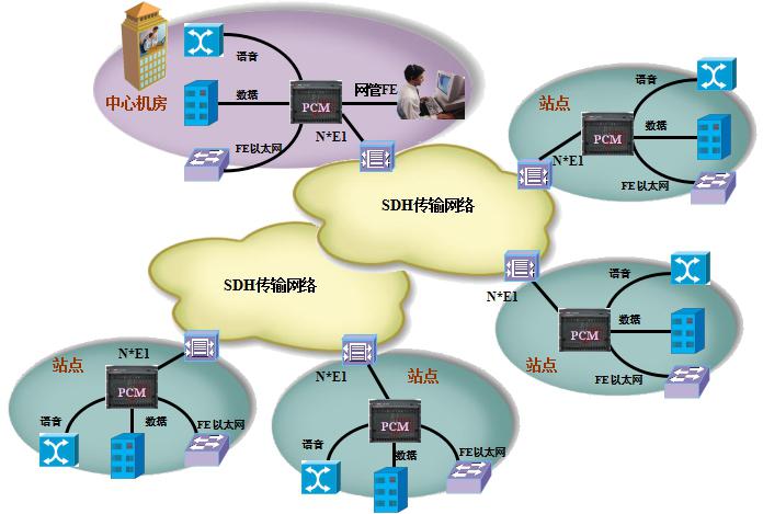 - PCM設(shè)備主要以E1鏈路作為承載通道,與SDH網(wǎng)絡(luò)之間通過多E1捆綁的方式,將業(yè)務(wù)傳輸至SDH網(wǎng)絡(luò),并實(shí)現(xiàn)全網(wǎng)業(yè)務(wù)最終匯接至中心機(jī)房